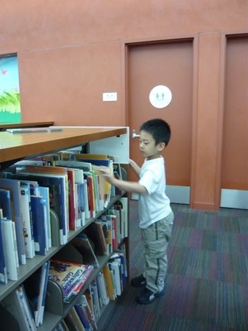弟弟在Picture Book (繪本)區找書。按照美國圖書館的分類,繪本區有各年齡的孩子看的書。