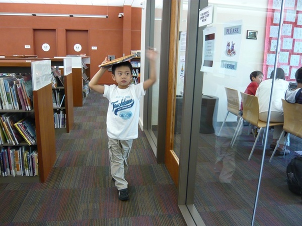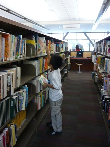 因為住處離社區圖書館非常近,加上孩子愛看書,所以常去。這裡的圖書館員,對孩子的問題有問必答,而且非常專業有效率,他們的腦中幾乎載滿所有童書資訊,而且,他們不但告訴你書在哪裡,還親自起身帶每個讀者去找到書,我想也是這樣不斷反覆練習累積經驗,所以才會對每一本書瞭若指掌。我相信也因為他們這種服務熱忱,讓孩子從小借書時伴隨著是愉快溫暖的經驗,這種"書本=快樂-" 的連結,在大腦內留下美好印象,自然而然,閱讀是種樂趣,而不是壓力。